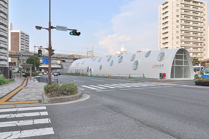 駅は多くの人が日常的に使う重要な施設だ。なのになぜか日本の駅舎は貧相なものが多い。そんな中で、きちんとコンペで建築家を選びユニークな形を実現させたアストラムライン新白島駅は異色の存在だ。 建築家は空間デザインは得意だが、トンネルや高架橋の設計はできないし、鉄道関係の法規や構造にも明るくない。かといって土木技術者に全部任せると野暮な仕上がりになってしまう。つまり良い駅舎を作るには建築と土木の連携が欠かせない。本作では土木スケールの構造物から人が触れるディテールまで丁寧にデザインされており、協業はうまくいったようだ。 施設の構成はシンプルで、道路の中央分離帯に穴を掘ってホームを作り、放物線を描いた鋼板の大屋根を載せている。屋根には大小の丸窓が開けられ、外光を取り込むとともに独特な外観を形作る。地下駅だが天井は高く、しかも天井・壁とも白く塗られ、閉鎖的な印象はない。夜景もなかなか魅力的だ。アストラムラインのデザインは新交通システムとして日本一だと思うが、本作によってさらにレベルが上がったのは誇らしいことだ。 残念なところもある。実は当初案では大屋根が山陽線の手前まで伸びる予定だったのだが、コストなどの事情により途中で切れてしまった。その結果、歩道橋下の空間はパブリックスペースとは呼べない単なる通路になってしまい、造形としても不自然だ。いつの日か当初案に戻せないだろうかと思う。 |
