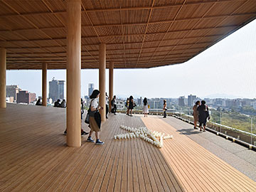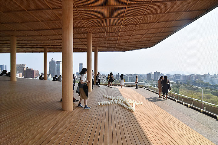 原爆ドームのすぐ背後に建つオフィスビル。もとは1978年に建てられた、いわゆる旧耐震基準の建物だったが、建て替えると景観規制の影響で床面積が減ってしまう。そこで壊さずに改修することになり、耐震補強を兼ねて東西にバルコニーや階段を増築、外壁は作り直し、さらに屋上を展望台として一般公開すべく大屋根が追加された。 ひろしまの丘と命名された屋上の展望台からは平和記念公園を一望でき、高所かつ屋外なので広島ならではの風の変化を体感することもできる。また、ヒノキ材で覆われた床はゆるく傾斜しており、空間に変化をつけ景色を見やすくするとともに風を感じやすくしている。屋上の下階には折り鶴をテーマにした体験ゾーンやギャラリー、1階には物産店やカフェが配された。オフィスフロアは非公開だが、ワーカー向けのバルコニーや自然換気へのこだわりなど、普通のオフィスにはない個性を持つ。 屋上は風を感じながら景色を眺めるという機能に純化され、そこにデザインが応えてレベルの高い空間が成立し、実際に多くの人がたたずんでいる。これまでの広島にはなかった空間体験をもたらしている。また、建物を壊さなくても改修でここまでできると全国に範を示した意義も大きい。ビルの効率が低下したとしても屋上を一般公開する、原爆ドームの横という立地にふさわしい機能を入れると決めたオーナーの見識こそがこの場を形作ったと言ってよいだろう。 ※屋上は有料にて一般公開 |