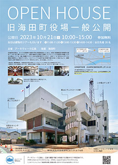 | 旧海田町役場一般公開 <建物公開> ■日時: 2023年10月21日(土)10:00-15:00 <ガイドツアー> ■日時: 2023年10月21日(土)11:00-11:30、13:00-13:30、14:00-14:30 ■定員: 各回20名(当日先着) ■会場: 旧海田町役場(安芸郡海田町上市14-18) ・JR海田市駅より徒歩8分 ・旧役場の駐車場は非常に少ないため、公共交通機関をご利用ください。 ■主催: アーキウォーク広島 ■後援: 海田町 ■参加無料、申込不要 |