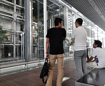 | 吉田 清掃工場の場合、社会見学ルートを設定するのは普通だけど、ここまで工場設備を見せているのは他に例がない。見せるべきものとしてデザインしているから見応えがある。 ――美術館設計を得意とする谷口さんらしいアプローチですね。 吉田 広島市はリバーフロントを大切にするから、ここはしっかりと作っておきたかったのではないかな。広島は海が近い割に海に近づける場所が少ない。しかもここは中洲の突端という貴重な場所。 小川 マッシブなヴォリュームを都市軸に沿って抜いている、そのシンプルな構成が気持ちいい。アトリウム内部の空間を最優先につくる設計者の意図が外部から見える様々なディテールの工夫から読み取ることが出来る。空気の通らないアトリウム内の樹木は可哀想な感じがする。 |