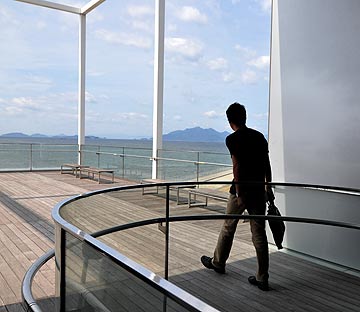 | 土井 普通、清掃工場の裏側にまで見学者が来ることはない。貫通通路を設けて来訪者を裏側まで来させて海を見せようというのは新しい試み。 吉田 不整形な敷地に四角い建物を置いているから余白が生じているけども、うまく処理できていると思う。 土井 建物を見る時には建物そのものから見てしまうけど、敷地に対しての配置計画やそこに配置することから生まれる余白空間も面白いね。中工場であれば背後の公園部分にどう人を導くか、公園部分のスケール感をどう設定するかとか。 |