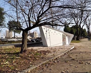 | ――続いては広島市内の公園に次々と誕生している公衆トイレ「ひろしま・パーク・レストルーム」の一つ、吉島公園の事例についてお聞きしたいと思います。この一連の作品は、小川さんが広島市のコンペで最優秀賞を取って実現しました。 土井 屋根の色に目を引く原色を選んでいるのがいいよね。公園施設はアースカラーで木とか土の色になりがちだけど、あえて周りから浮き立つ色を選んでる。 小川 屋根の色は公園の遊具で使われる鮮やかな色をイメージしていて、しかも公園ごとに変えてます。色の選定は割と単純で、吉島公園の場合はトイレ予定地の脇にイチョウがあったから黄色。 土井 公衆トイレのデザインを(設計入札ではなく)コンペで選ぶということ、そして同じデザインのトイレが次々と広島市内に生まれているということは、小さいけども都市的なインパクトがある。もちろん僕たち建築家にとってもエキサイティングな出来事だと思う。 ――トイレは二等辺三角形のプランで、その先端は北を向いています。 土井 広島という場所を考えると、三角形の頂点を爆心地に向けるのもあると思うけど、それは考えなかった? 小川 全て北向きとしたのは、全てのレストルームで同じ光の空間を作りたかったのと、広島の子供たちがグローバルな視点を持って世界の中での広島を意識できる仕掛けとして考えたため。平和都市だからと言って爆心地を意識させることが公園で遊ぶ未来ある広島の子供たちへのメッセージとして本当に良いのか分からないし、都市のインフラ建築としてより普遍的な軸を埋め込みたくて、こういう提案にまとめました。 ――街路グリッドがはっきり見られる都心の公園に建てれば、実は広島の道路が東西南北から少し傾いていることが分かって面白そうです。 小川 それは面白いですね。 土井 トイレ単体ではなく、トイレの軸線を合わせるなど都市レベルで全体をひとつのアイデアとして提案した事はすごく面白い。ラ・ヴィレット公園のような様々な要素が重なって最終的に全体が完成するような。 ――デザイン上の細かい工夫などはありますか。 小川 屋根をできるだけ軽く見せたいという思いから、南東又は南西から見たときには軒下が隠れて屋根が一枚乗っているだけのように見えるようにしてます。窓はガラスだと割られる恐れがあるのでアクリルで。通常公園のトイレはガラスブロックが多いけど、割れたときのメンテナンスが結構大変なので。 吉田 こういった不特定多数が自由に利用する場所がデザインされているということは確実に生活の質を上げる。実際に見てみると再確認できるね。 土井 今後はトイレだけじゃなくて、公園自体のデザインもしていく必要があるんじゃないかな。都市部の建物がどんどん更新される中で、公園だけはスケール感が変わらないというのは貴重なことだと思う。そういうところこそ、この人がデザインしたというものがあっていい。 |